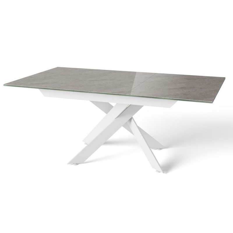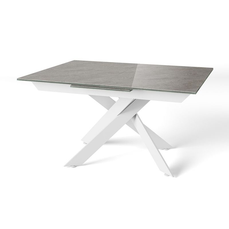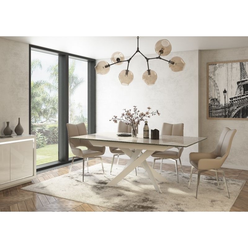 Design: 5.5mm marble effect ceramic topped on 8mm glass, auto-rise extension mechanism, powder coated legs, ultra modern design, ceramic is highly durable, and heat and scratch resistant.